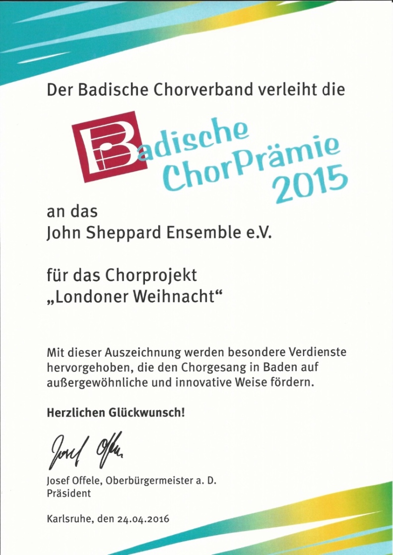 Rezension von Herbert Binniger über Jubilee! - 500 Jahre englische Chormusik - 20 Jahre John Sheppard Ensemble in der Badischen Zeitung vom 12.11.15