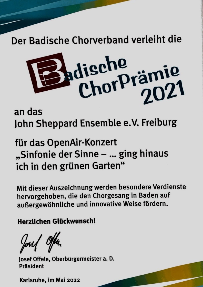 26.07.2021 - "... ein Abend der zarten Töne (...) Kammerchorkunst." Rezension von Elke Kamprad über das Projekt ging hinaus ich in den grünen Garten des John Sheppard Ensembles in der Badischen Zeitung.